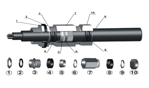 Parts of Glands : 1) Check Nut, 2) Washer, 3) Nipple Entry Part, 4) Synthetic Inner Rubber, 5) Armour Clamping Cone, 6) Armour Clamping Ring, 7) Main Gland Body, 8) Synthetic Outer Rubber Seal, 9) Washer, 10) Compression Nut. All the metal parts are made of Brass (except washers), as per the Approved Design.